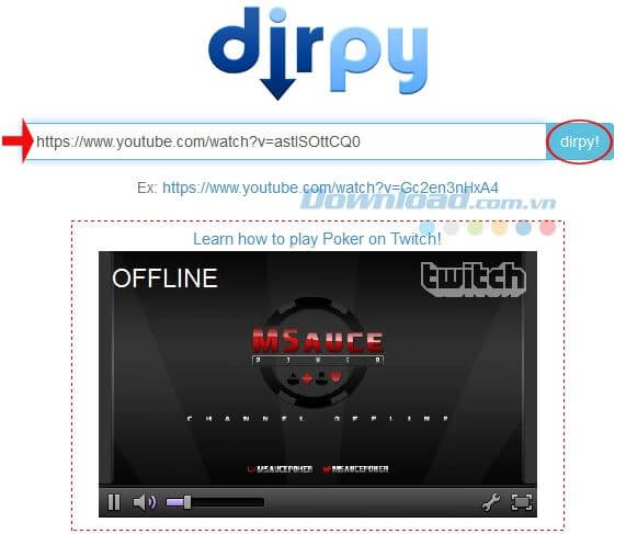 Bước 2: Truy cập tiếp vào dịch vụ chuyển đổi video thành nhạc trực tuyến Dirpy. Sau đó, paste link vừa copy từ YouTube vào khung trống trên trang web này, rồi nhấn Dirpy.